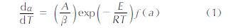 式中:α为转化率; β为加热速率; R为气体分子常数; E为表观活化能; A为指前因子; f(α)为反应机理函数。