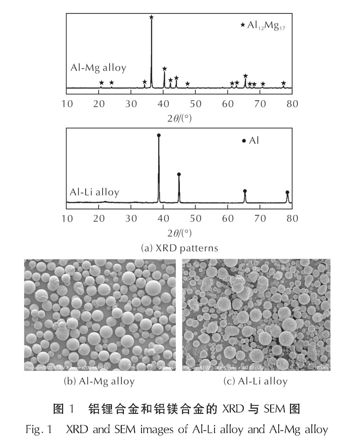 两种铝合金的XRD曲线与SEM图如图1所示。从图1可以看出,铝镁合金中主要检测到Al12Mg17相的存在,没有观察到单质铝或单质镁相。铝锂合金中只观测到铝的衍射峰,没有观察到锂的衍射峰,但铝的衍射峰半峰宽明显增加,这可能是由于铝锂合金中锂含量较低,且锂固溶在铝颗粒内部所造成的。从样品的SEM图中可以看出,铝镁合金粉末由球形颗粒组成,颗粒球形度较好,且颗粒表面较为光滑。同样的,铝锂合金粉末也由球形颗粒组成,但相比于铝镁合金,铝锂合金颗粒球形度较差,表面附着有较多纳米级颗粒,且颗粒粒度分布范围较大,存在较多小尺寸合金颗粒。