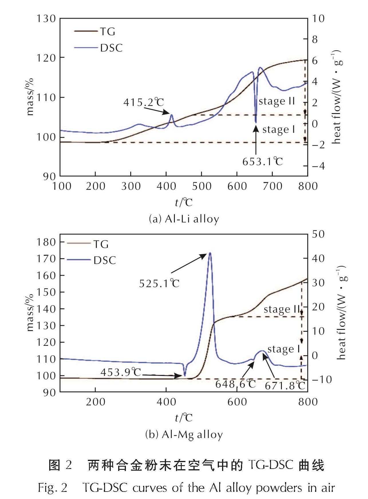 两种铝合金的TG-DSC曲线如图2所示。从图2可以看出,铝锂合金在415.2℃左右存在一个小的放热峰,这是合金中的锂相被空气氧化所导致的; 在653.1℃存在一个吸热峰,这是合金中的铝相熔化所导致的。从铝锂合金的TG曲线上可知,合金质量在温度高于200℃之后即开始缓慢上升,且大致存在两个阶段。由于铝锂合金中锂的质量分数约为5%,当其氧化生成Li2O后,样品质量理论上可增加5.7%,因此第一阶段对应锂的氧化放热,第二阶段则对应合金中铝相的氧化增重。与单质铝不同,铝锂合金中的铝在熔点前便已经发生一定程度的氧化,这种现象很可能是锂的加入导致的。