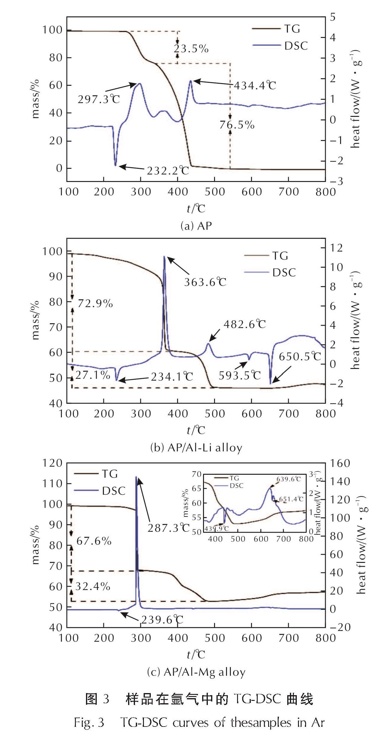 AP/铝锂合金和AP/铝镁合金样品在氩气中的TG-DSC曲线如图3(b)和(c)所示。对于AP/铝锂合金而言,在234.1℃左右观察到一个吸热峰,这是样品中AP晶型转变所导致的[22],此时AP由斜方晶型转为立方晶型。此后AP/铝锂合金样品的TG-DSC曲线上观察到了典型的AP分解的两阶段放热过程,低温分解阶段发生在363.6℃左右,样品中AP失重约为72.9%,放热量约为303.2J/g,高温分解阶段发生在482.6℃左右,样品中AP失重约为27.1%,放热量约为123.9J/g。在AP完全分解之后,样品的DSC曲线在593.5℃和650.5℃左右分别存在两个吸热峰,其中后者应该是样品中的铝相熔化吸热造成的。焦清介等[23]的研究表明,铝粉的加入对AP的低温放热峰有抑制作用,对高温放热分解反应有促进作用,且其低温分解阶段与高温分解阶段失重率和纯AP相差不大。根据图2(a),铝锂合金加热时,在415.2℃左右存在一个由于锂氧化反应所导致的放热峰,且样品质量增加,且其第一反应阶段与AP的分解阶段相重合,因此,在AP分解过程中,锂的存在起到了重要的作用。