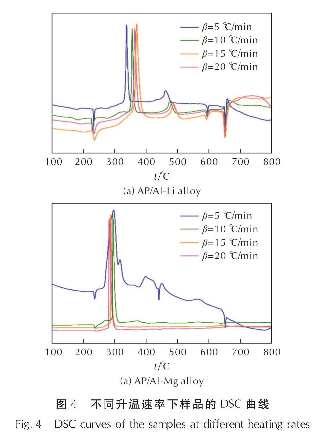 为了分析铝合金对AP反应动力学的影响,分别记录了AP/铝锂合金、AP/铝镁合金在不同升温速率下的DSC曲线,其结果如图4所示。在非等温条件下,多相反应系统中的反应动力学方程可以用式(1)表示[25]: