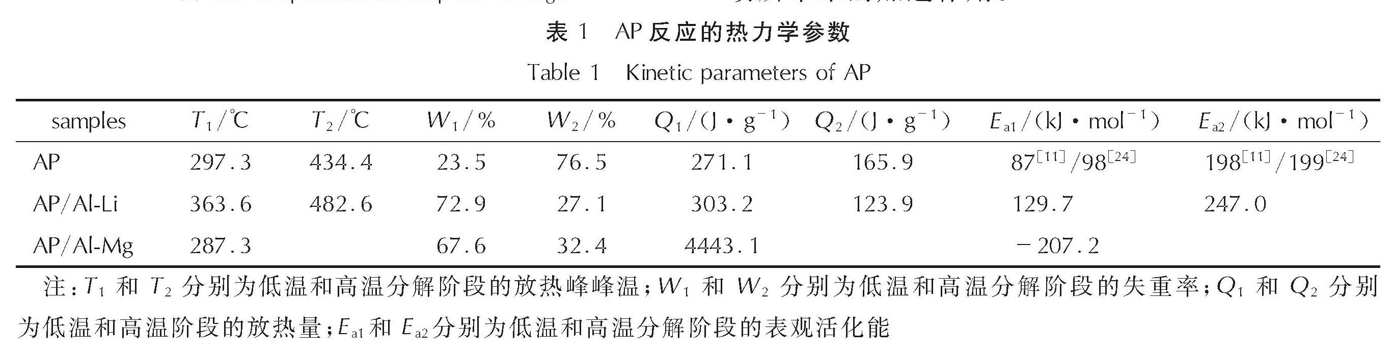 (3)使用Kinssinger法对加入铝锂合金后AP分解的表观活化能进行计算,得到AP低温分解阶段的表观活化能约为129.7kJ/mol,高温分解阶段表观活化能约为247.0kJ/mol。