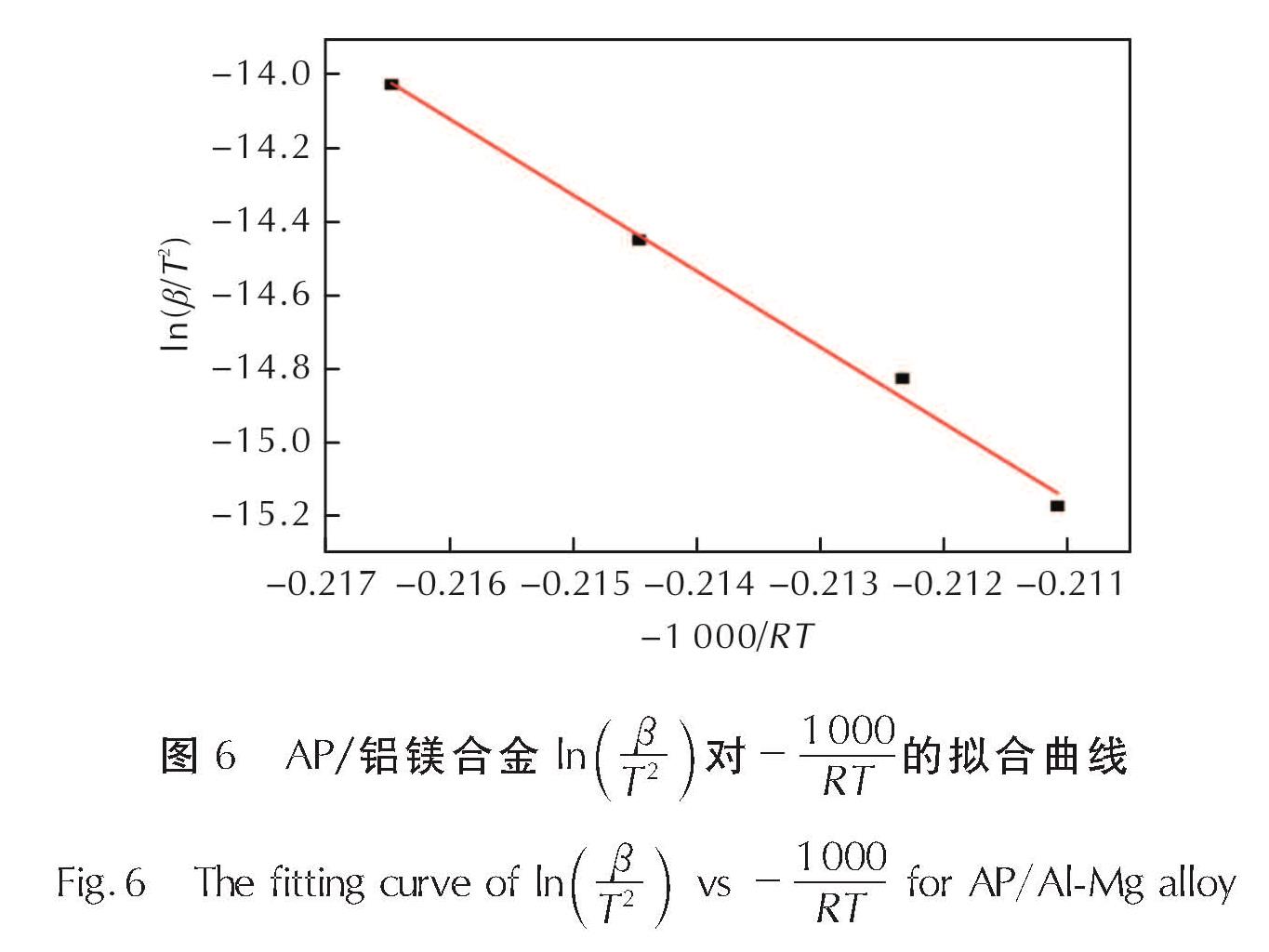 Fig.6 The fitting curve of ln((β)/(T2)) vs -(1000)/(RT) for AP/Al-Mg alloy