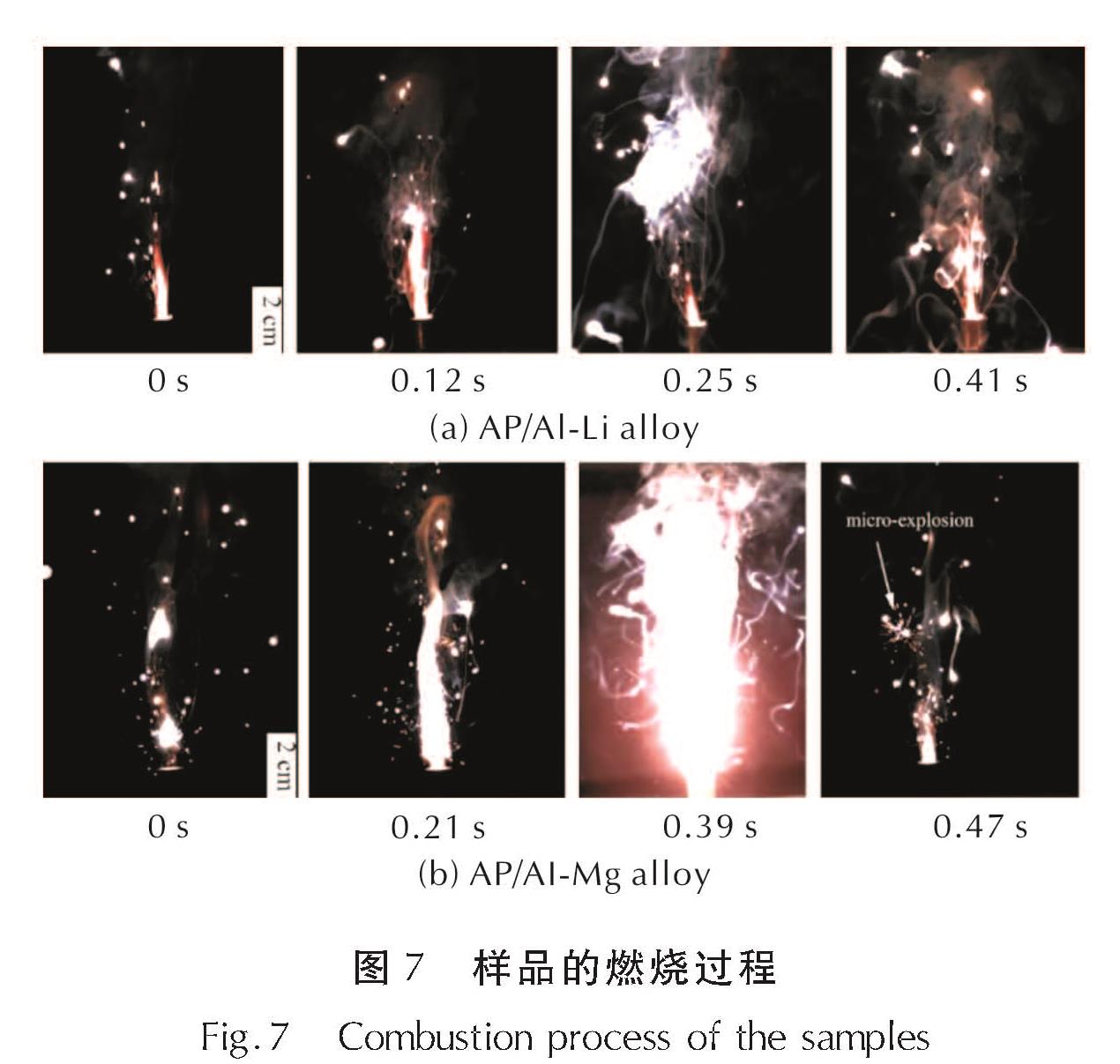 (5)当AP/铝锂合金燃烧时,AP的分解较为缓慢,其气相燃烧较弱,气相火焰尺寸较小,燃烧产物中检测到了铝单质,说明铝锂合金未能完全燃烧。当AP/铝镁合金在空气中燃烧时,AP分解迅速,其燃烧更为剧烈,气相火焰尺寸更大,燃烧产物主要由MgO和MgAl2O4组成,说明铝镁合金反应完全。