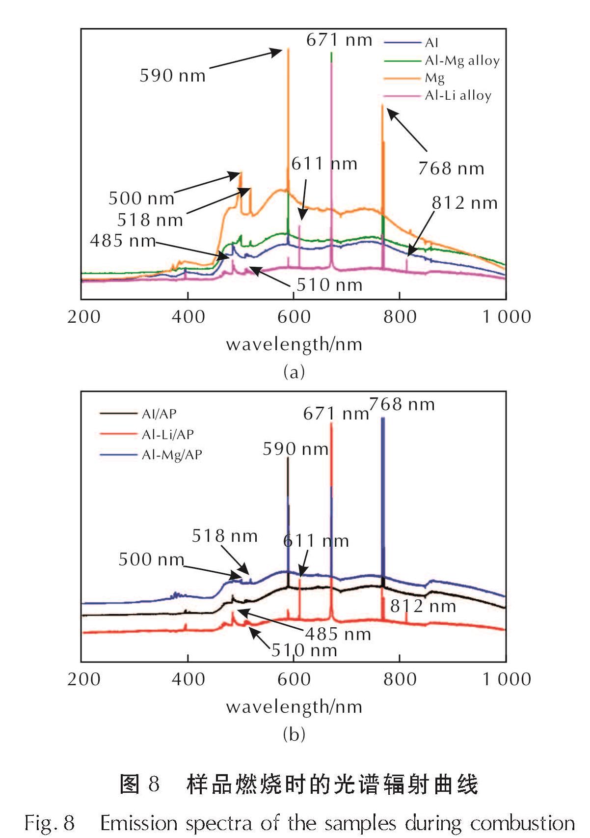 对AP/铝锂合金与AP/铝镁合金样品燃烧过程中的光谱辐射特性进行分析,并与铝单质、镁单质、铝镁合金在空气中燃烧时的光谱辐射曲线进行对比,结果如图8所示。从图8可知,铝单质、镁单质、铝镁合金在空气中燃烧时,在590、671和768nm处均存在辐射峰。不同的是,铝单质和镁单质在470~530nm之间存在不同的特征辐射峰。其中,铝单质在485nm和510nm处分别存在两个特征辐射峰,镁单质在500nm和518nm处分别存在两个特征辐射峰。对于铝镁合金而言,其同样在500nm和518nm处观察到了两个特征辐射峰,说明当铝镁合金在空气中燃烧时,其气相燃烧主要为镁的燃烧。而对于含有AP的样品,同样在590、671、768nm处观察到了3个特征辐射峰。同时,对于AP/铝锂合金样品而言,其671nm处的特征辐射峰相对强度有所增加,485nm和768nm处特征辐射峰相对强度降低。对于AP/铝锂合金,其在485nm和510nm处观察到了与铝单质燃烧时相似的特征辐射峰,表明AP/铝锂合金燃烧时存在铝的气相燃烧。对于AP/铝镁合金,其不仅在485nm和510nm处观察到了特征辐射峰,还在500nm和518nm处也观察到了特征辐射峰,说明AP/铝镁合金燃烧气相火焰中同时存在镁的气相燃烧和铝的气相燃烧。