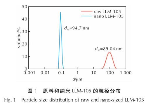 Fig.1 Particle size distribution of raw and nano-sized LLM-105由图1可知,原料LLM-105的粒径为89.04μm,粒度分布范围较宽,介于26.3~239.9μm; 而纳米化之后的LLM-105颗粒粒度分布窄,粒径在68.1~122nm之间,为94.7nm。表明通过机械球磨法成功制备出粒度均一的纳米级LLM-105颗粒。