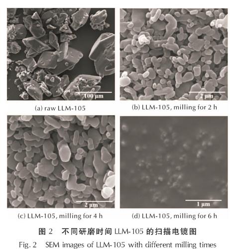 Fig.2 SEM images of LLM-105 with different milling times由图2(a)可知,原料粗颗粒LLM-105晶体形状主要为菱形等不规则多面体结构,存在孔洞、孪晶等结晶缺陷,且粒径分布不均匀,大多数颗粒粒径在100μm以上,少量颗粒粒径仅10μm左右。如图2(b)和(c)所示,在机械研磨过程中,原料粗颗粒LLM-105受到剪切力、碰撞力、摩擦力等多重力协同作用,在晶体缺陷处先破碎,粒径逐渐减小,随着研磨时间的增加,大颗粒逐渐细化为细颗粒,表面棱角逐渐消失,形貌趋于规整的类球形结构,最终,获得如图2(d)所示的纳米LLM-105颗粒,形貌规整,粒度分布窄,与粒度测试结果基本一致。