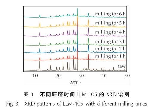 Fig.3 XRD patterns of LLM-105 with different milling times从图3中可以明显看出,原料LLM-105的XRD谱图中峰主要出现在12.1°、28.4°、33.2°,分别对应着(0 1 1)、(-1 -4 1)和(-1 -5 1)晶面。而不同研磨时间下LLM-105的XRD曲线与原料基本一致,XRD峰的位置没有发生变化,也没有新峰产生或消失,表明机械球磨法不改变LLM-105的晶体结构。