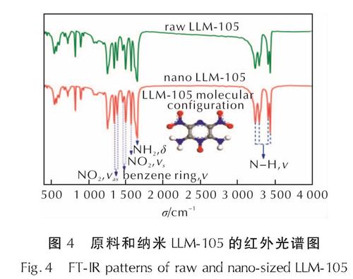Fig.4 FT-IR patterns of raw and nano-sized LLM-105根据图4可以看出,LLM-105纳米化前后的FT-IR谱图基本一致,衍射峰的位置和强度并未发生明显变化,主要出峰位置可以归属如下:3500~3000cm-1范围内的多个吸收峰属于N—H伸缩振动峰。由于LLM-105晶体中存在大量分子间和分子内氢键,导致两个—NH2不再等效,故而形成4个峰。1647cm-1是—NH2的变形振动产生的吸收峰; 1565cm-1为—NO2的反对称伸缩振动; 1337cm-1和1379cm-1为—NO2的对称伸缩振动; 1490cm-1和1452cm-1为吡嗪环振动所引起的。原料LLM-105与研磨后的LLM-105相比,FT-IR谱图的官能团的峰强与位置都未发生变化,这说明研磨过程中没有引入杂质。XRD和FT-IR测试结果表明,通过机械球磨法制备的纳米LLM-105结构并未发生改变,也未引入其他杂质,从而可以保证纳米LLM-105的高品质。