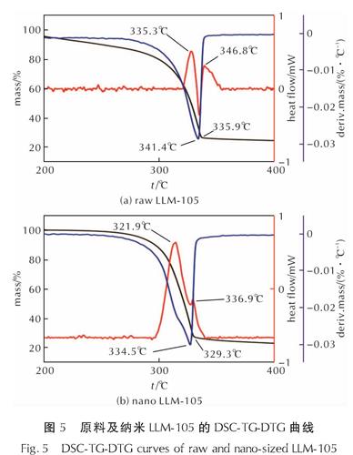 Fig.5 DSC-TG-DTG curves of raw and nano-sized LLM-105从图5中可以看出,原料及纳米LLM-105的TG曲线上仅一个失重阶段,分别对应于一个DTG峰(341.4℃和334.5℃),纳米化之后的热分解明显提前; 而在DSC曲线上可以看到,在400℃之前均有一个主放热峰和一个微弱的肩峰,且纳米LLM-105的主分解峰温较原料LLM-105提前了约13.4℃,肩峰提前了约9.8℃。根据文献[26],随着温度的逐渐升高,LLM-105分子结构中的—NO2和—NH2等基团优先发生裂解反应,碳骨架也随之氧化,该过程耗氧率较高,释放大量热量; 随后在第二阶段,中间产物进一步反应,生成NO和C2N2等气体,释放的热量减少,从而形成了DSC曲线上的第一强放热峰和第二弱放热峰。