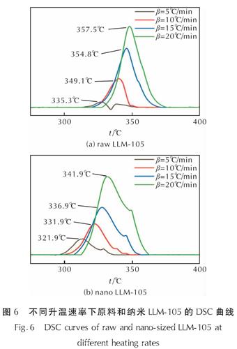 Fig.6 DSC curves of raw and nano-sized LLM-105 at different heating rates由图6可知,随着升温速率的提高,两种LLM-105的分解放热峰温均提高。相较于原料LLM-105,研磨后的纳米LLM-105分解放热峰温提前了约13~18℃,意味着纳米LLM-105反应活性提高,在较低温度下更快分解。相比于原料粗颗粒LLM-105,纳米化之后的LLM-105比表面积显著增大,吸热效率明显提高,且拥有更多的活性位点,表现为热分解温度提前。