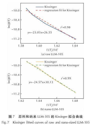 图7 原料和纳米LLM-105的Kissinger拟合曲线
