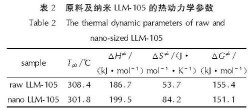 Table 1 The Kissinger equation parameters of raw and nano-sized LLM-105对LLM-105的热性能进行进一步的分析,采用如下公式(2)~(5)可计算得到升温速率趋于0时的峰温(Tp0)、活化焓(ΔH≠)、活化熵(ΔS≠)和吉布斯自由能(ΔG≠)。