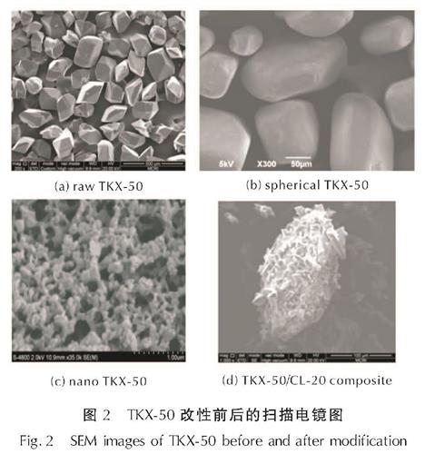 Fig.2 SEM images of TKX-50 before and after modification晶体的形貌、规则程度、粒度等对于含能化合物性能有巨大影响,对于同一种化合物不同晶形而言,能量和感度也不相同,对含能化合物进行重结晶、机械球磨、粉碎等处理使其纳米化、球形化能在一定程度上改善其应用性能。米向超等[43-45]考察了实验过程中多种因素对TKX-50结晶过程的影响,并结合TKX-50晶体生长特点以及结晶热力学和动力学数据,确定了TKX-50球形化最佳条件。毕福强等[45]采用降温法、溶剂-非溶剂法等重结晶工艺获得TKX-50粒度范围是1~50μm,当反溶剂为氯仿时,可得最小粒径达2.8μm,并且晶体表面光滑、形状趋于球型,应用潜力巨大。Jiao等[46]基于液体中介质在蒸发干燥过程中发生自组装聚集原理制备了具有分层框架微观结构的纳米TKX-50,大幅度降低了TKX-50粒度,提高了反应性,但同时撞击感度有了部分升高。为了进一步提高纳米TKX-50安全性,姜炜等[47]采用机械球磨法和真空冷冻干燥技术制备了形貌呈类球形的纳米TKX-50,平均粒径为72.6nm,颗粒大小均匀,且引入杂质极少,与工业微米级TKX-50相比,热稳定基本不变,安定性和安全性得到了一定提高。