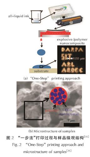 美国率先开展了火工品的增材制造技术研究。早在1999年,美国国防高级研究计划局(DARPA)即投资了一项为期4年、经费4500万美元的“介观综合形电子学(Mesoscopic Integrated Conformal Electronics,MICE)”项目,旨在开发出适用于低温/无掩模共形表面的直写电子制造工具[32],其中包括直写引信(Direct Write Fuzing)预研项目,即将喷墨打印技术与传统火工技术相结合,以期实现火工品的直接快速、高精度成型。