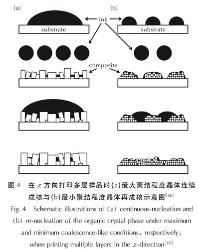 图4 在z方向打印多层样品时(a)最大聚结程度晶体连续成核与(b)最小聚结程度晶体再成核示意图[36]