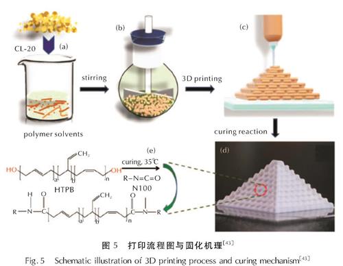 2013年,中国工程物理研究院化工材料研究所的聂福德团队[41]将球磨法制备的超细CL-20与聚乙烯醇(PVA)/水/乙基纤维素(EC)/异丙醇(IPA)的复合黏结剂体系结合,获得高能直写炸药油墨,最小直写线宽可达80.2μm,装药厚度为0.54mm时爆轰临界尺寸为0.36mm,爆轰性能明显提高。随后,还研究了含亚微米CL-20、聚叠氮缩水甘油醚(GAP)、多异氰酸酯(N100)的复合含能油墨,打印出表面光滑,无裂纹、孔隙等缺陷的三维周期性结构样品,能够在0.4mm×0.4mm尺寸下可靠爆轰[42]。此外,为实现含能油墨连续、高质量打印,该团队设计了含质量分数85%亚微米CL-20、11.25%端羟基聚丁二烯(HTPB)和3.75%N100的乳液型含能油墨配方(如图5所示),在20 ℃室温下打印出复杂结构样品,再在35 ℃下进一步固化成型,所获得的样品具有良好的均一性和稳定性,且燃烧性能优异,该研究为燃烧/爆炸性能可调的梯度结构火炸药的成型提供了很好的技术策略[43]。
