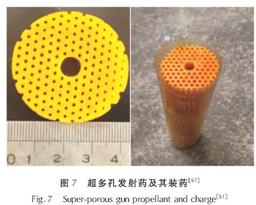 Fig.7 Super-porous gun propellant and charge[61]在此基础上,又设计并制备出由质量分数50%的RDX、25%的环氧丙烯酸酯、12.5%的N-丁基硝氧乙基硝胺、12.5%的稀释剂和添加剂组成的发射药,并进行了燃烧性能测试与30mm枪击试验,结果表明打印的发射药样品表现出较低的线性燃烧速率和较高的压力指数(1.46),出口速度为420m/s。此外,南京理工大学的何卫东团队[62]成功开发出适用于发射药打印成型的挤出沉积式增材制造样机,通过填充速度、填充率和底板温度等关键工艺参数的调节,成功打印出压缩强度高达230MPa的发射药样品,对于国内在发射药增材制造领域的发展具有极大的推动作用。
