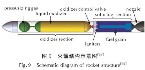 Fig.9 Schematic diagram of rocket structure[66]2018年初,印度科学研究院[67]报道了一种适用于增材制造的复合推进剂配方,包含高氯酸铵(AP,粒径小于125μm,氧化剂),铝粉(Al,燃料),三氧化二铁(Fe2O3,质量为AP的2%,催化剂),HTPB(黏合剂),己二酸二辛脂(DOA,增塑剂),异氟尔酮二异氰酸酯(IPDI,固化剂),且氧化剂与燃料的质量比为78:22,增塑剂与固化剂、黏合剂的质量比为10:10:80,Al与AP的质量比为10:90,利用材料挤出技术逐层堆积成型,再将药柱放置于60℃下固化7天,获得的推进剂药柱密度、燃速与传统浇注工艺制备的药柱基本相当(如图10和11所示)。