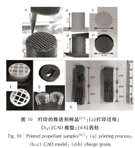 图10 打印的推进剂样品[67]:(a)打印过程; (b,c)CAD模型;(d-h)药柱