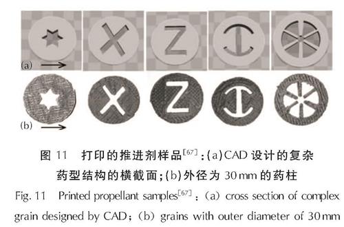 图11 打印的推进剂样品[67]:(a)CAD设计的复杂药型结构的横截面;(b)外径为30mm的药柱