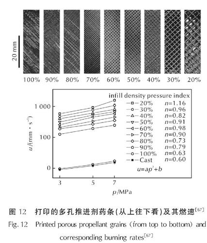 Fig.11 Printed propellant samples[67]:(a)cross section of complex grain designed by CAD;(b)grains with outer diameter of 30mm在此基础上,印度科学研究院设计并成功制造出多种具有复杂异型结构的复合固体推进剂药柱,验证了增材制造技术相对传统浇注工艺在特殊药型结构装药上的优势; 进一步地,研究人员还打印出具有不同孔隙率的药柱,通过沿药柱轴向填充密度的改变,从而实现推进剂燃速的梯度可控(如图12所示),该研究成果充分证明了增材制造技术在复杂结构推进剂性能调控方面的应用潜力。