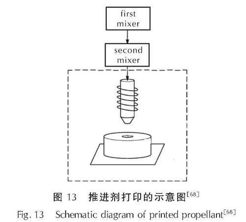 Fig.12 Printed porous propellant grains(from top to bottom)and corresponding burning rates[67]同年2月份美国雷神公司公布了一份关于推进剂增材制造的专利[68](如图13所示),提出两级混合釜,先将推进剂组分(无固化剂)在1级混合釜中预混,混合均匀后药浆流入2级反应釜(加固化剂)中进一步混合,此时药浆黏度逐渐增大,控制在合适的黏度区间内进行挤出成型,从而可以避免传统推进剂固化时间长、黏度大、打印效果差等问题,为固体推进剂的增材制造提供了新思路。
