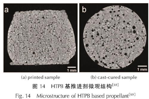 Fig.13 Schematic diagram of printed propellant[68]2019年,美国普渡大学的McClain团队[69]基于增材制造技术,分别以HTPB和光敏聚氨酯作黏合剂,打印出固含量为85%、黏度高达69×104Pa·s的AP基复合推进剂。在打印完成后,含HTPB的推进剂需在60℃固化3天,而含光敏聚氨酯的推进剂仅需放置在UV灯下固化30min,大大提高了推进剂制造效率。药柱内部微观结构显示打印成型样品内部孔隙要远小于浇注成型样品,而光固化成型样品内部最密实,品质更好(如图14和15所示); 另外打印成型的样品燃速与浇注样品相当。研究结果对于高固含量、超高黏度、复杂几何结构推进剂的快速成型研究具有重要的参考价值。