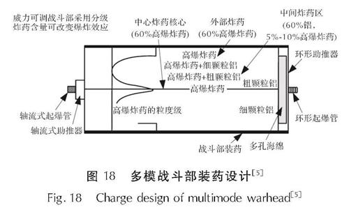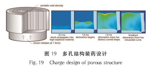 炸药是弹药战斗部等武器做功的能量来源,是推动实现武器系统“远程精确打击,高效高能毁伤”的核心部件[76]。面对当前复杂的国际局势和作战环境,新型战斗部的开发和使用对混合炸药装药指出了新的发展方向,如美国海军航空系统司令部(NASC)设计了一种径向复合装药结构,通过改变内部空穴形状实现威力调控(如图17所示); 劳伦斯-利弗莫尔国家实验室提出了“双炸药+多起爆点”的装药设计方法(如图18所示),可实现对战斗部爆轰威力的调节[4-5]; 洛斯阿拉莫斯国家实验室设计出了一种阵列式多孔装药结构,可通过径向孔隙密度变化调节爆轰波形达到爆轰威力可控(如图19所示)。因此积极探索威力可控/毁伤模式可调的新型炸药装药技术具有重要的战术战略意义[77]。