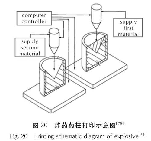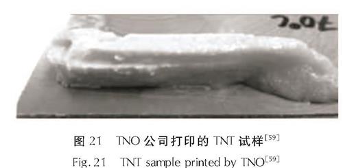 Fig.20 Printing schematic diagram of explosive[78]同年,荷兰TNO公司报道称采用TNT进行熔融沉积成型,并成功打印出约300层的三维结构样品[59](如图21所示)。尽管这只是一次概念性演示,但证实了熔铸类含能材料增材制造的可行性。
