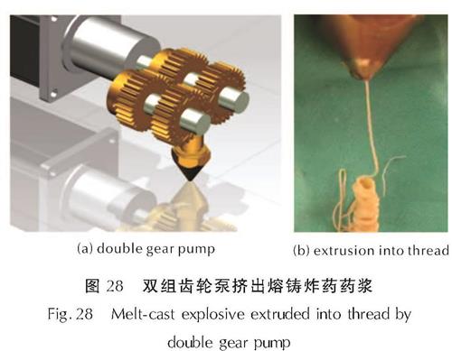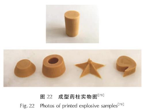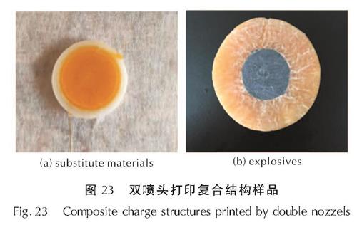 Fig.21 TNT sample printed by TNO[59]国内方面,2018年以来,南京理工大学的姜炜团队[79-80]基于FDM法开展了高性能熔铸炸药的研究工作,团队自主研发了熔铸炸药增材制造原理样机,设计并制备出与打印喷头相匹配的纳米环四亚甲基四硝胺(HMX)/三硝基甲苯(TNT)基熔铸炸药配方,成功制备出多种结构的纳米HMX/TNT熔铸炸药药柱(如图22所示),测试结果表明成型药柱的密度及均一性明显提高,内部缺陷少,且抗压强度相比提高了273.0%左右,爆速提高了约2.1%,综合性能明显增强,验证了FDM技术在高质量熔铸炸药制造方面的优势。在此基础上,进一步开发了双喷头含能材料增材制造装置,初步实现了外高爆速(HMX/TNT)、内高爆热(HMX/TNT/Al)型复合炸药装药成型(如图23所示),从而为复杂异型炸药装药技术发展提供了可行思路。