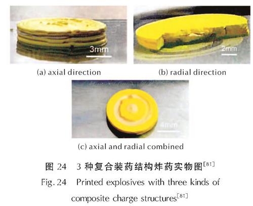 2019年,中国工程物理研究院的聂福德团队[81]以CL-20和三氨基三硝基苯(TATB)为主体炸药,分别配制了CL-20基高能炸药油墨和TATB基钝感炸药油墨,并通过喷墨打印技术获得了3种复合结构的炸药药柱(如图24所示),撞击感度测试表明利用增材制造技术获得的复合结构炸药装药可有效提高CL-20炸药装药的安全性,验证了增材制造技术在复合装药上的技术优势。
