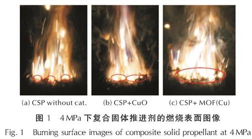 LIU等[16-17] 研究了以4, 4'-偶氮-1, 2, 4-三唑(atrz)为前驱体合成3D的[Cu(atrz)(NO3)2]n(MOF(Cu))作为燃烧催化剂对复合固体推进剂(CSP)性能的影响。MOF(Cu)可将AP和CSP的分解峰温和分解活化能降低。与CuO相比,MOF(Cu)的催化活性更高,使CSP表现出高燃速、低压强指数和特殊的火焰结构(4MPa下的燃烧火焰结构如图1),可能是原位生成的纳米CuO比微米CuO颗粒比表面积更大,更有利于AP分解成气相产物NH3和HClO4中的质子/电子转移。此外MOF(Cu)的加入还有效降低了CSP的机械感度,摩擦感度从40%降至32%,撞击感度从39.4cm降至63.5cm,其原因是受到外部机械刺激时,3D的MOF(Cu)分子结构被破坏,可吸收部分机械能,使CSP的机械敏感度降低。