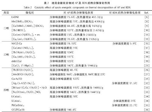 呋咱类化合物具有钝感、热稳定性高、密度大等优点,合成的含能化合物具有较好的爆炸性能,但呋咱环存在配位能力差的问题,故将配位位点丰富的四唑类与呋咱相结合以有效弥补该缺陷。常帅等[36]用四唑基呋咱类衍生物3-氨基-4-(四唑-5-基)呋咱(ATZF)、3-硝基-4-(四唑-5-基)呋咱(NTZF)、3-羟基-4-(四唑-5-基)呋咱(HTZF)等为能量配体,合成了一系列高氮含量钝感的金属含能配位聚合物(M=Cu,Zn或Co),均具有较高的热稳定性,其中OTZFCu(Ⅱ)对AP的热分解催化效果最明显,其爆轰性能也较优越。唑类含能化合物对AP及RDX的热分解催化作用见表2。