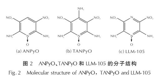 2,6-二氨基-3,5-二硝基吡嗪-1-氧化物(LLM-105)与ANPyO结构类似,以氮杂环代替苯环为基本结构,并用高能的N+→O-代替C—NO2,有效提高生成热,改善氧平衡,具有低成本、低感度和高爆炸性能的特点,ANPyO、TANPyO和LLM-105的分子结构见图2。