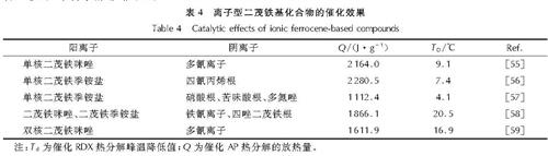 一般而言,离子型含能二茂铁类燃烧催化剂分子量越大,迁移率越低; 含氮量越多,则放热量越高,热稳定性越高,分解时生成的催化活性物质氧化铁粒度越小,比表面积越大,催化效率越高,离子型二茂铁化合物的催化效果见表4。