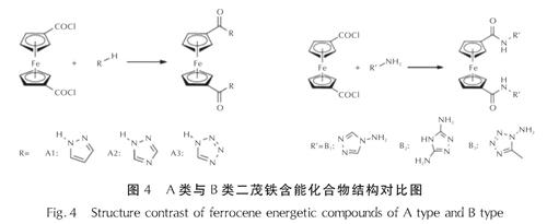 此外,苟小锋课题组[68-69]以氮杂环与二茂铁二甲酰氯为原料,合成了两类二茂铁含能化合物,结构见图4。其中A类酰氯直接与氮杂环内氮原子反应,B类酰氯与氮杂环链接的氨基氢反应。整体而言,B类因存在分子间氢键,稳定性高,而A类具有较强的刚性,受热后分子结构更易坍塌,使AP的分解峰温提前更多(最多提前175℃),最高可达到3744J/g,但放热不集中,预计在AP基推进剂中具有一定的应用前景。