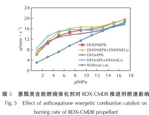 研究表明,含羰基化合物可吸收固体推进剂燃烧产生的紫外光,从而达到提高燃速的目的。汪营磊[70-73]结合该特点和芳香性酸盐燃烧催化剂特点设计合成了1, 8-二羟基-4, 5-二硝基蒽醌(DHDNE)为母体的新型燃烧催化剂DHDNEM(M=Ba、Mn、Co、Ni、Cu、Zn、Pb),并研究了DHDNEM(M=Pb、Cu)对双基推进剂和RDX-CMDB推进剂的影响。加入DHDNEPb后,RDX-CMDB推进剂在2~12MPa范围内均能得到较大幅度的提高,在6~14MPa范围内,n为0.27,呈现宽平台燃烧; DHDNEPb和DHDNECu复合使用时可进一步提高燃速,同时使RDX-CMDB推进剂在8~18MPa压力范围内平台燃烧(n=0.23),说明Cu化合物的加入不仅有助于提高RDX-CMDB推进剂的燃速,还有助于降低压强指数,表明1, 8-二羟基-4, 5-二硝基蒽醌类催化剂在双基/改性双基推进剂中显现出较好的催化效果。与不含硝基的1, 8-二羟基蒽醌(DHAA)为母体合成的DHAAM(M=Pb、Cu)相比,含能DHDNEM在提高推进剂燃速方面更具有优势,具体见图5。