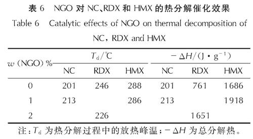 NGO对固体推进剂主要组分的热分解具有一定的催化作用。ZHANG等[76]研究了NGO对AP热分解的催化作用,可降低AP的起始分解温度,并能显著提高AP的表观分解热,最多可使AP的分解峰温降低106℃,效果优于GO。袁申[76-78]研究了NGO对NC、RDX和 HMX热分解的催化性能,结果表明NGO能明显提高NC的表观分解热,并可通过改善放热峰温度改善其热稳定性,具体见表6。