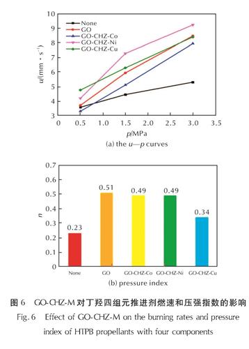 图6 GO-CHZ-M对丁羟四组元推进剂燃速和压强指数的影响