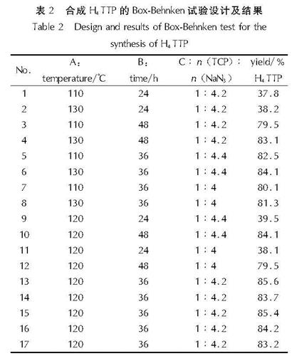 式中:A为反应温度,℃; B为反应时间,h; C为TCP与NaN3的摩尔比。