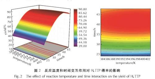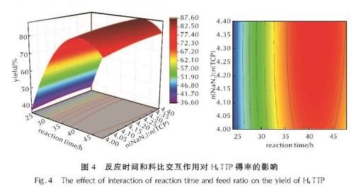 当TCP与NaN3反应摩尔比为1:4.2时,反应温度和时间对H4TTP的交互作用如图2所示。