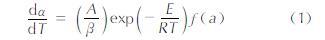 式中:α为转化率; β为加热速率; R为气体分子常数; E为表观活化能; A为指前因子; f(α)为反应机理函数。