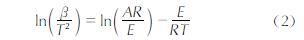 使用Kissinger-Akahira-Sunose方法计算AP分解的反应活化能。相比于其他方法,Kissinger法不需要确定反应动力学的具体机理,同时,其适用于各种固体材料的反应动力学研究,具有较高的可靠性和实用性,其计算公式如下[26]:
