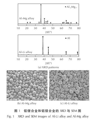 两种铝合金的XRD曲线与SEM图如图1所示。从图1可以看出,铝镁合金中主要检测到Al12Mg17相的存在,没有观察到单质铝或单质镁相。铝锂合金中只观测到铝的衍射峰,没有观察到锂的衍射峰,但铝的衍射峰半峰宽明显增加,这可能是由于铝锂合金中锂含量较低,且锂固溶在铝颗粒内部所造成的。从样品的SEM图中可以看出,铝镁合金粉末由球形颗粒组成,颗粒球形度较好,且颗粒表面较为光滑。同样的,铝锂合金粉末也由球形颗粒组成,但相比于铝镁合金,铝锂合金颗粒球形度较差,表面附着有较多纳米级颗粒,且颗粒粒度分布范围较大,存在较多小尺寸合金颗粒。