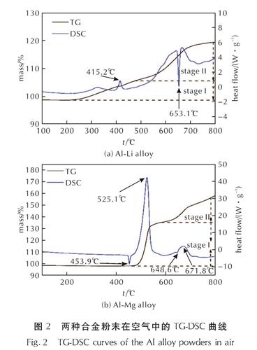 Fig.1 XRD and SEM images of Al-Li alloy and Al-Mg alloy两种铝合金的TG-DSC曲线如图2所示。从图2可以看出,铝锂合金在415.2℃左右存在一个小的放热峰,这是合金中的锂相被空气氧化所导致的; 在653.1℃存在一个吸热峰,这是合金中的铝相熔化所导致的。从铝锂合金的TG曲线上可知,合金质量在温度高于200℃之后即开始缓慢上升,且大致存在两个阶段。由于铝锂合金中锂的质量分数约为5%,当其氧化生成Li2O后,样品质量理论上可增加5.7%,因此第一阶段对应锂的氧化放热,第二阶段则对应合金中铝相的氧化增重。与单质铝不同,铝锂合金中的铝在熔点前便已经发生一定程度的氧化,这种现象很可能是锂的加入导致的。