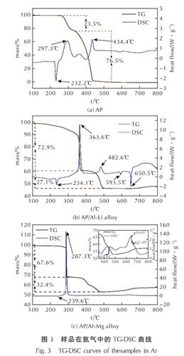 AP/铝锂合金和AP/铝镁合金样品在氩气中的TG-DSC曲线如图3(b)和(c)所示。对于AP/铝锂合金而言,在234.1℃左右观察到一个吸热峰,这是样品中AP晶型转变所导致的[22],此时AP由斜方晶型转为立方晶型。此后AP/铝锂合金样品的TG-DSC曲线上观察到了典型的AP分解的两阶段放热过程,低温分解阶段发生在363.6℃左右,样品中AP失重约为72.9%,放热量约为303.2J/g,高温分解阶段发生在482.6℃左右,样品中AP失重约为27.1%,放热量约为123.9J/g。在AP完全分解之后,样品的DSC曲线在593.5℃和650.5℃左右分别存在两个吸热峰,其中后者应该是样品中的铝相熔化吸热造成的。焦清介等[23]的研究表明,铝粉的加入对AP的低温放热峰有抑制作用,对高温放热分解反应有促进作用,且其低温分解阶段与高温分解阶段失重率和纯AP相差不大。根据图2(a),铝锂合金加热时,在415.2℃左右存在一个由于锂氧化反应所导致的放热峰,且样品质量增加,且其第一反应阶段与AP的分解阶段相重合,因此,在AP分解过程中,锂的存在起到了重要的作用。