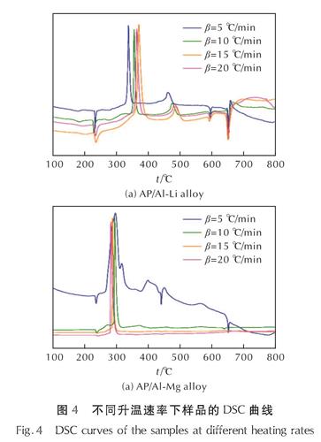Fig.3 TG-DSC curves of thesamples in Ar为了分析铝合金对AP反应动力学的影响,分别记录了AP/铝锂合金、AP/铝镁合金在不同升温速率下的DSC曲线,其结果如图4所示。在非等温条件下,多相反应系统中的反应动力学方程可以用式(1)表示[25]: