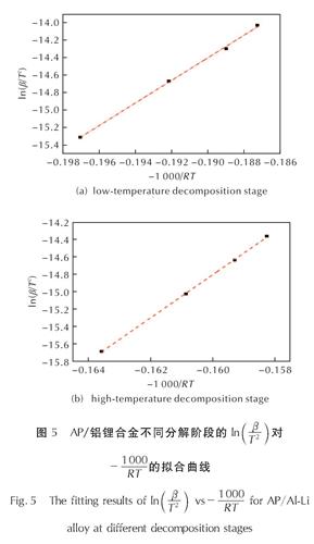 Fig.5 The fitting results of ln((β)/(T2)) vs-(1000)/(RT) for AP/Al-Li alloy at different decomposition stages由图5可知,在AP的低温分解阶段,AP/铝锂合金分解的表观活化能约为129.7kJ/mol,在高温分解阶段表观活化能约为247.0kJ/mol。表1列出了AP反应的热力学参数,从表1中可以看出,加入铝锂合金后,AP分解不同阶段的表观活化能均比纯AP高,活化能升高,说明AP分解时由基态转化为过渡态时所克服的能垒增加,AP分解速率降低。