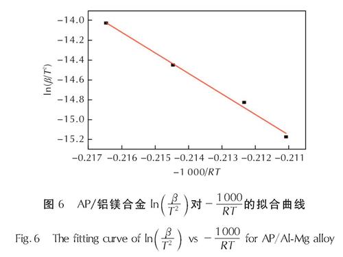 图6 AP/铝镁合金ln((β)/(T2))对-(1000)/(RT)的拟合曲线